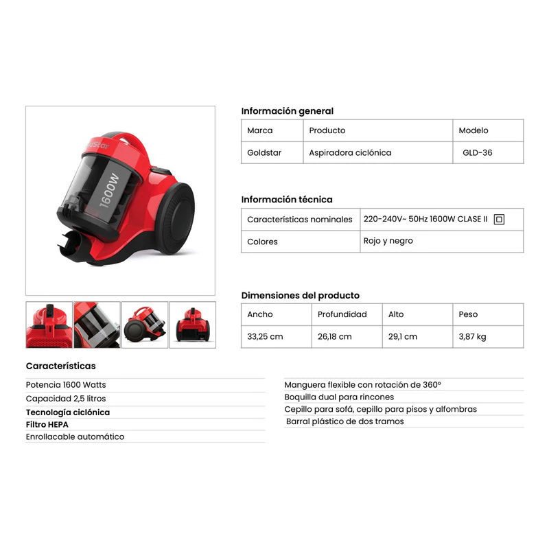 ASPIRADORA CICLÓNICA GLD-36 POTENCIA 1600 Watts
