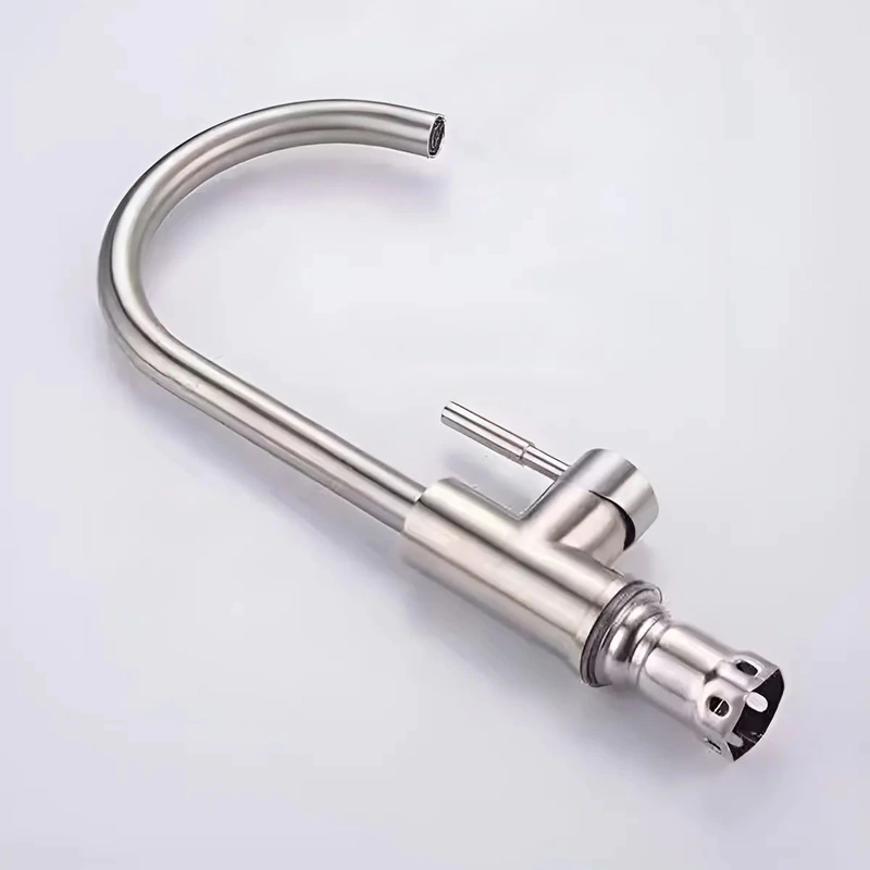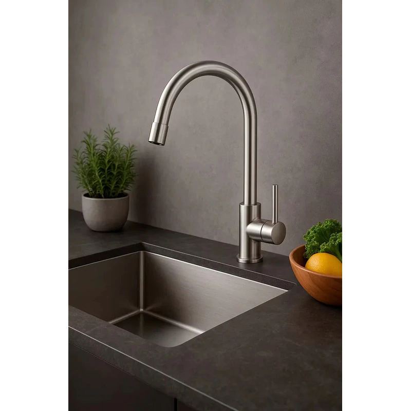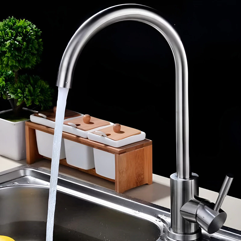De acero inoxidable, con diseño curvo alto tipo cuello de cisne que permite mayor comodidad para el llenado de ollas o la limpieza de utensilios grandes.