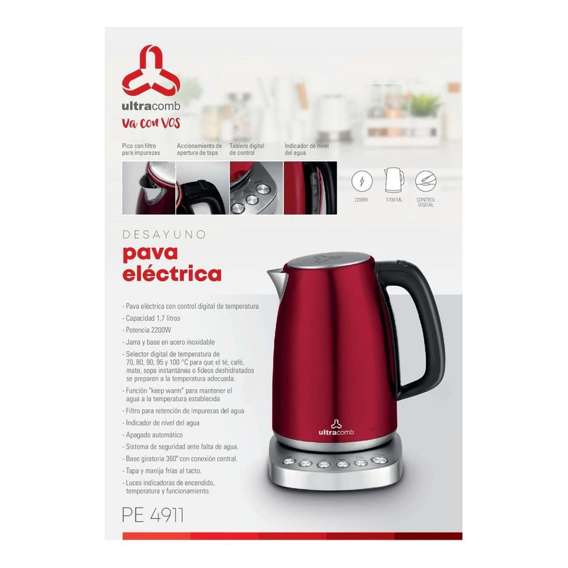 ¡Tené el agua caliente siempre lista! Con la pava eléctrica Ultracomb PE-4911 vas a poder disfrutar de una bebida caliente en minutos. Ganá tiempo y prepará ese mate, cafecito o porqué no, esa sopa instantánea que tanto te gusta.